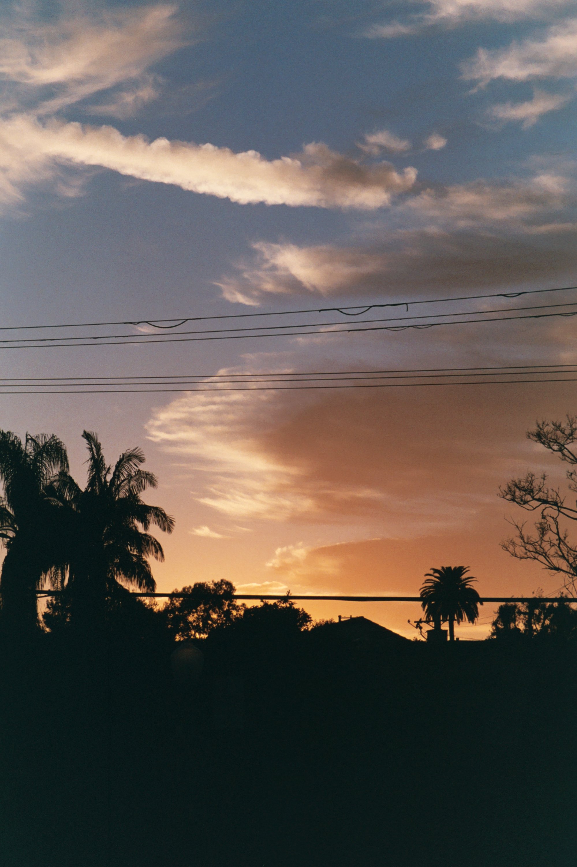 powerlines and trees framing a sunset